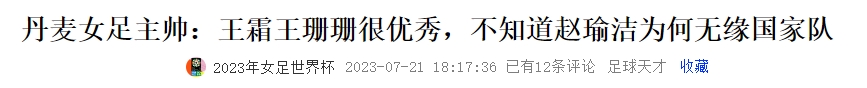 今夏的女足世界杯中,留洋的赵瑜洁落选中国女足国家队。赵瑜洁目前效力于丹超克厄女足,上赛季随队拿到联赛冠军。世界杯期间的采访中,丹麦女足主帅曾对赵瑜洁落选感到不解。