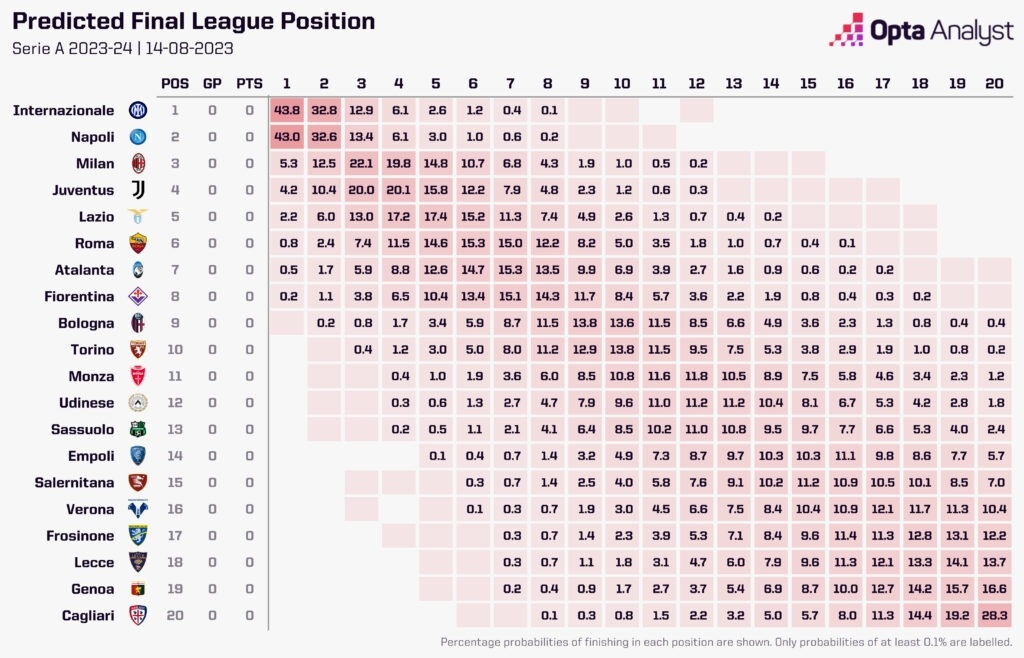 Opta通过超级计算器模拟了10000次23-24赛季比赛,结果显示国际米兰是意甲夺冠的最大热门,概率达到了43.8%,而那不勒斯紧随其后为43%。