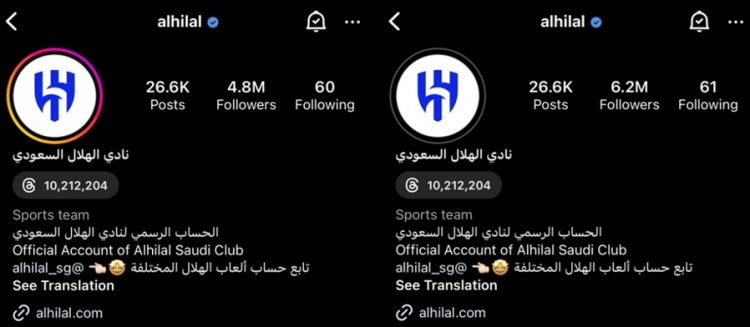 据悉,在不到24小时内,利雅得新月的INS官方账号粉丝数,便从480万涨至620万。
