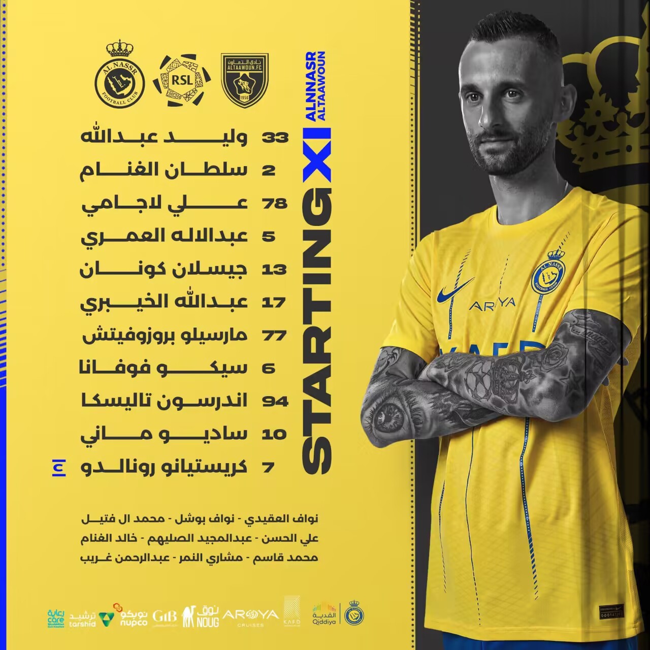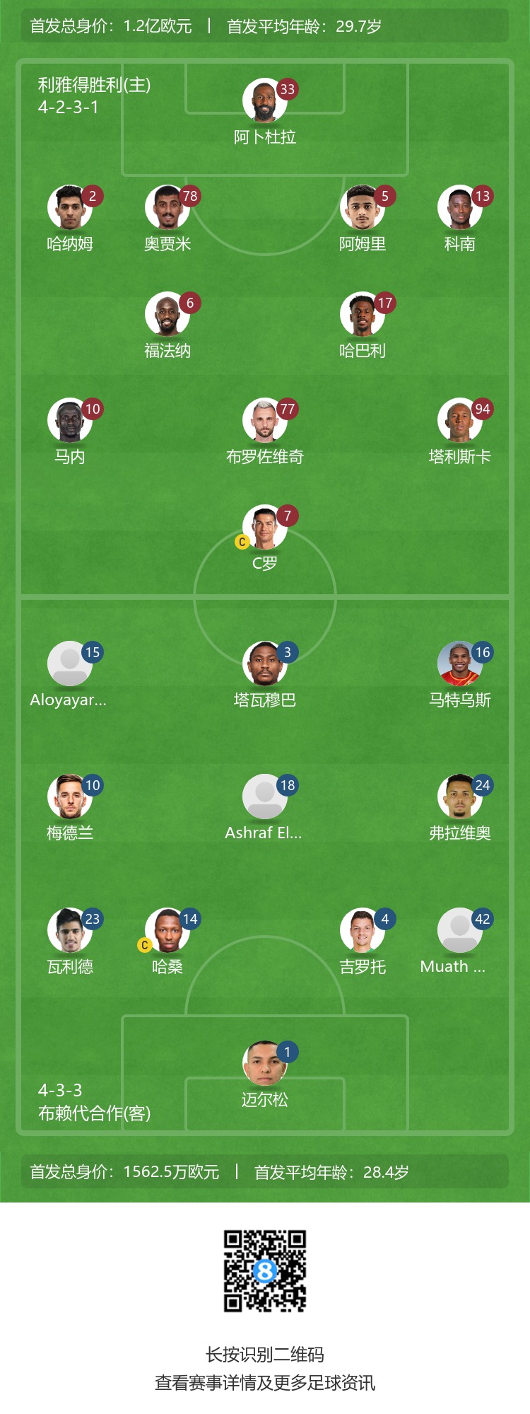 利雅得胜利首发:33-阿卜杜拉、2-哈纳姆、78-奥贾米、5-阿卜杜拉-阿姆里、13-科南、17-哈巴利、77-B罗、6-塞科-福法纳、94-塔利斯卡、10-马内、7-C罗