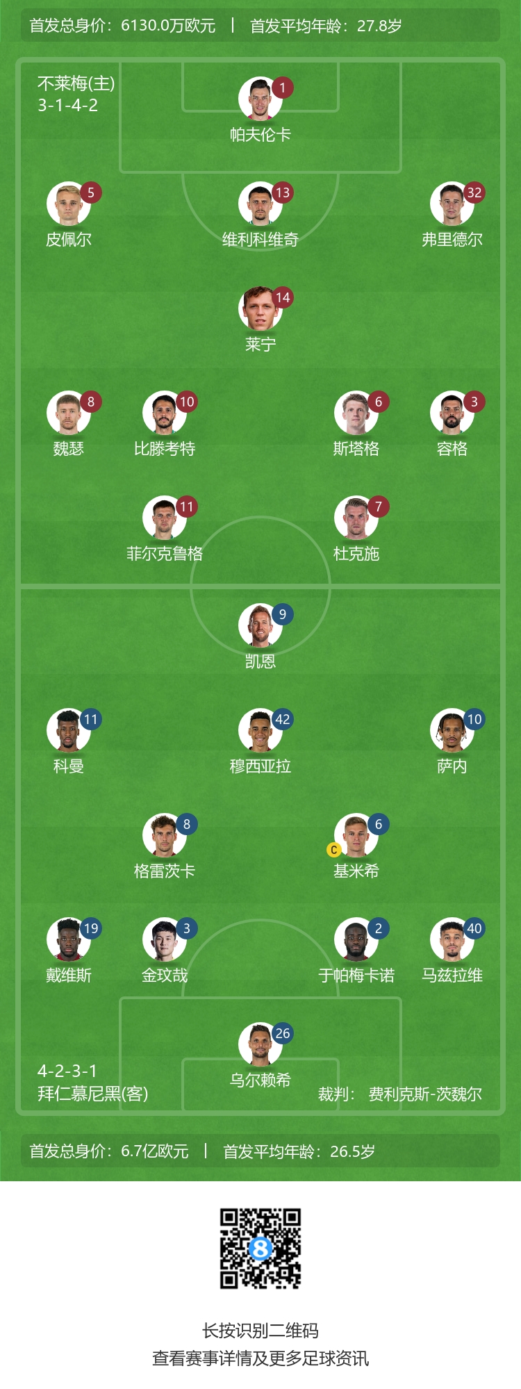 拜仁首发:26-乌尔赖希、19-阿方索-戴维斯、3-金玟哉、2-于帕梅卡诺、40-马兹拉维、8-格雷茨卡、6-基米希、11-科曼、42-穆西亚拉、10-萨内、9-凯恩