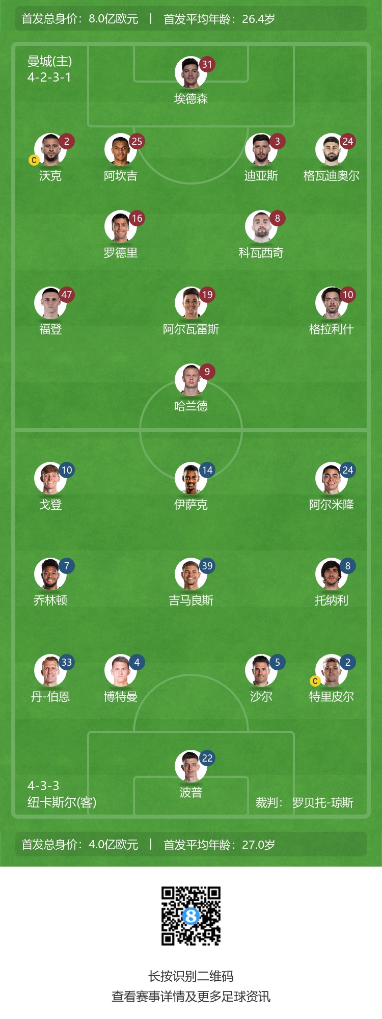 曼城首发:31-埃德森、2-沃克、25-阿坎吉、3-鲁本-迪亚斯、24-格瓦迪奥尔、16-罗德里、8-科瓦西奇、47-福登、10-格拉利什、19-阿尔瓦雷斯、9-哈兰德