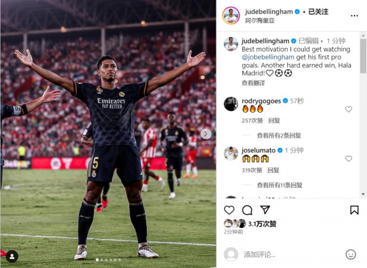 赛后贝林厄姆晒照恭喜弟弟并庆祝胜利:看到弟弟打进他职业生涯的第一粒进球,这是我最好的动力来源。又是一场来之不易的胜利,Hala Madrid!