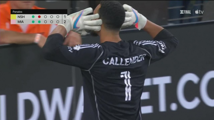 第二轮,纳什维尔球员里亚尔主罚的点球被迈阿密门将卡伦德扑出,扑出点球后,他也是做出了梅西在世界杯的经典庆祝动作。