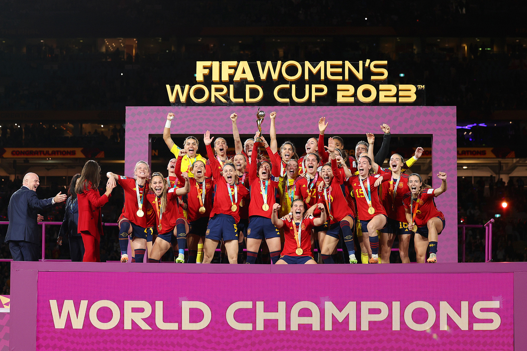 赛后的颁奖仪式,西班牙女足全队举起女足世界杯冠军奖杯,共同庆祝此次胜利。