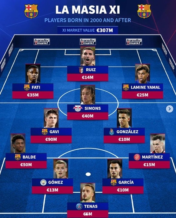 德转列拉玛西亚00后最佳阵:总身价3.07亿欧元
