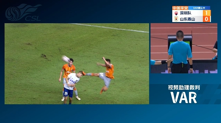 慢镜头回放显示,刘越一脚飞踹直接踢在了陈蒲的脑门上!主裁判第一时间给了黄牌,在回看VAR后改判直红!