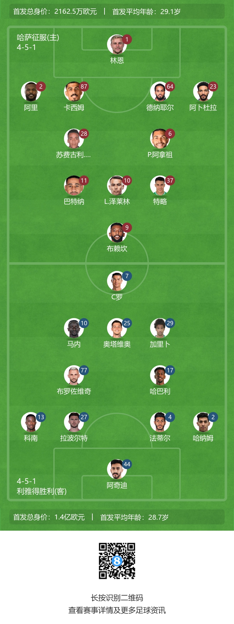 利雅得胜利首发:44-阿奇迪、2-哈纳姆、4-法蒂尔、27-拉波尔特、13-科南、17-哈巴利、77-布罗佐维奇、25-奥塔维奥、29-加里卜、7-C罗、10-马内