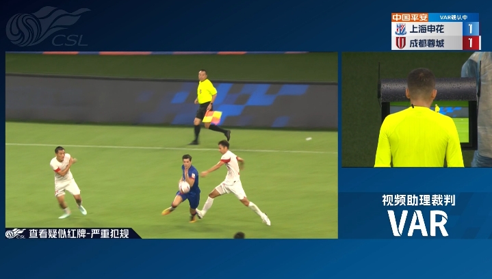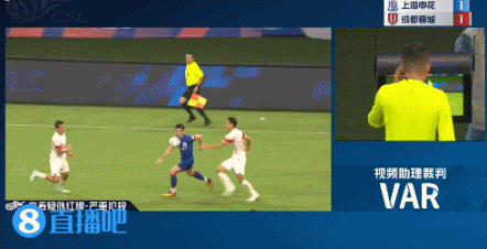 随后VAR介入,主裁判张雷去看回放后改判!取消黄牌,改为直红!
