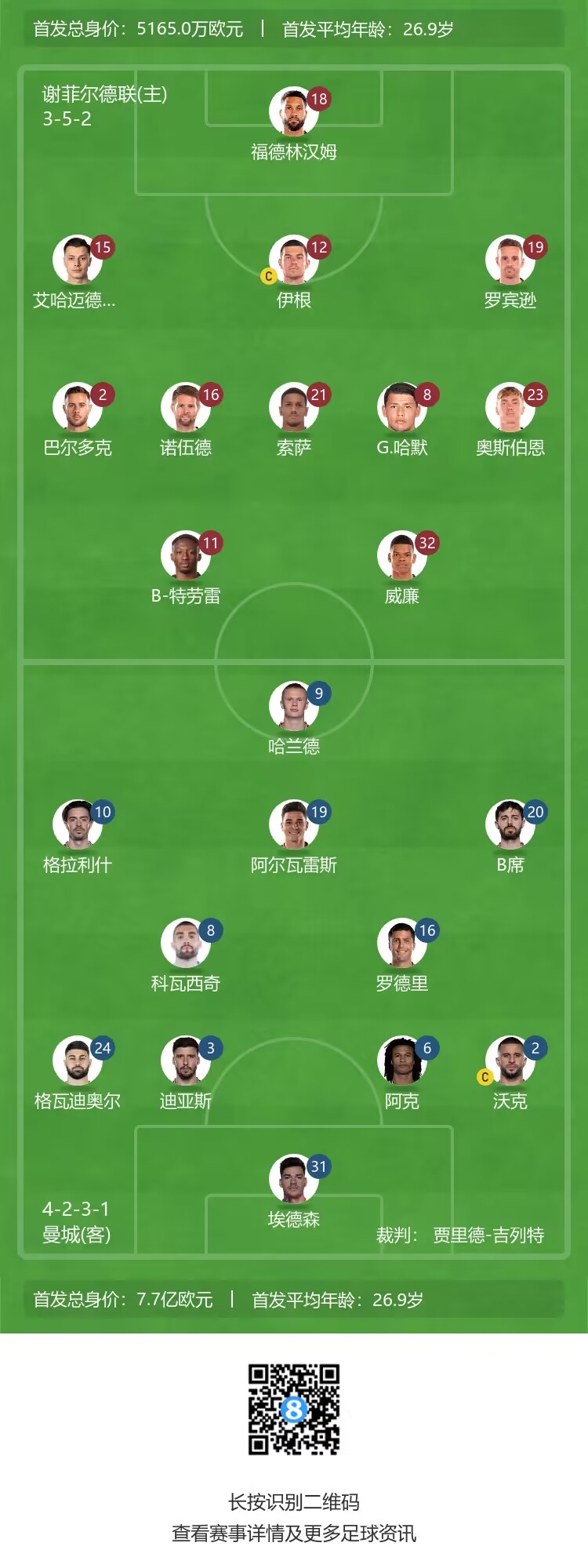 谢菲联首发:18-福德林汉姆、12-伊根、15-艾哈迈德霍季奇、19-杰克-罗宾逊、8-哈默尔、21-德索萨-科斯塔、2-巴尔多克、16-诺伍德、23-奥斯伯恩、32-威廉-奥苏拉、11-贝尼-特劳雷