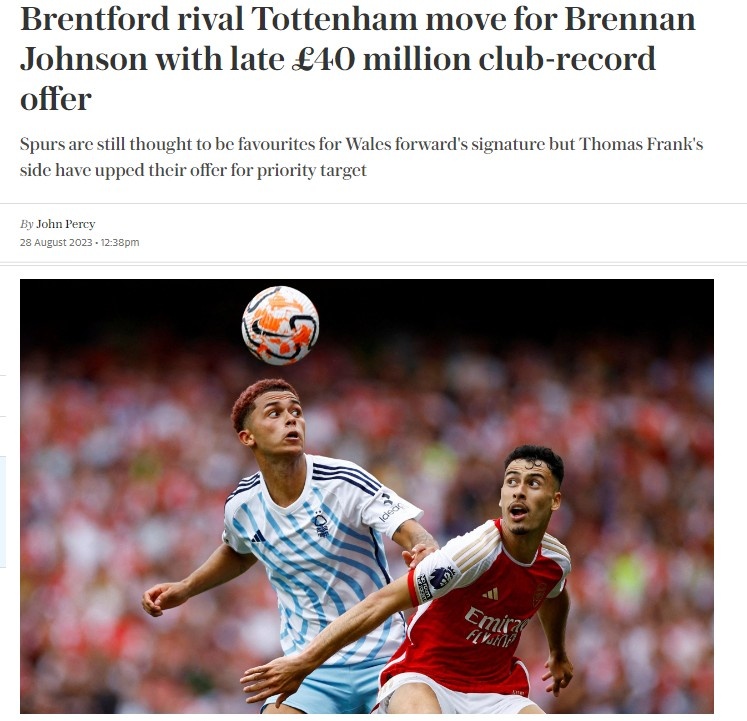 直播吧8月28日讯 据英国媒体《每日电讯报》报道,布伦特福德与热刺之间关于诺丁汉森林中场布伦南-约翰逊的竞争愈发激烈,布伦特福德已经为布伦南-约翰逊开出了创造队史纪录的4000万英镑报价。