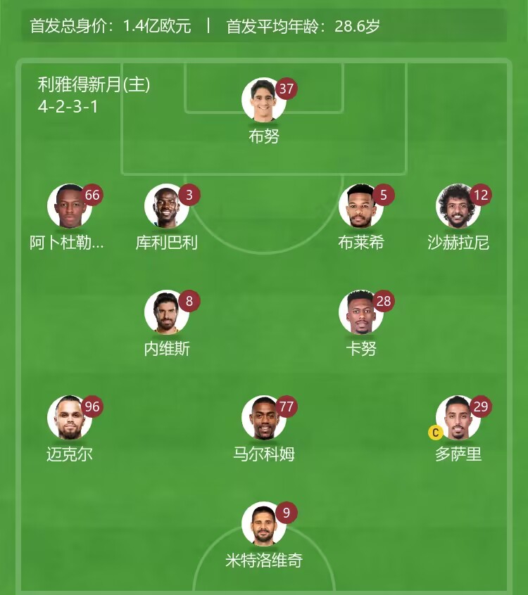 利雅得新月首发:37-布努、66-阿卜杜勒哈米德、3-库利巴利、5-布莱希、12-沙赫拉尼、8-鲁本-内维斯、28-穆罕默德-卡努、96-迈克尔、29-萨勒姆-达瓦萨里、77-马尔科姆、9-米特洛维奇