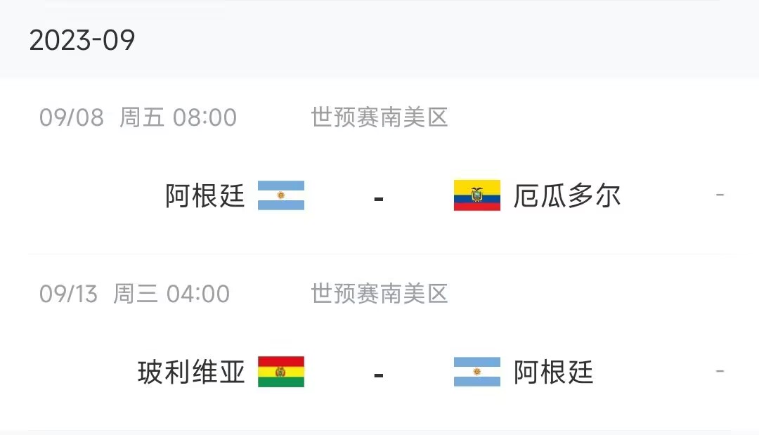 阿根廷将在接下来的国际比赛日参加两场世预赛比赛,分别是北京时间9月8日8:00主场vs厄瓜多尔,9月13日凌晨4点客场vs玻利维亚。