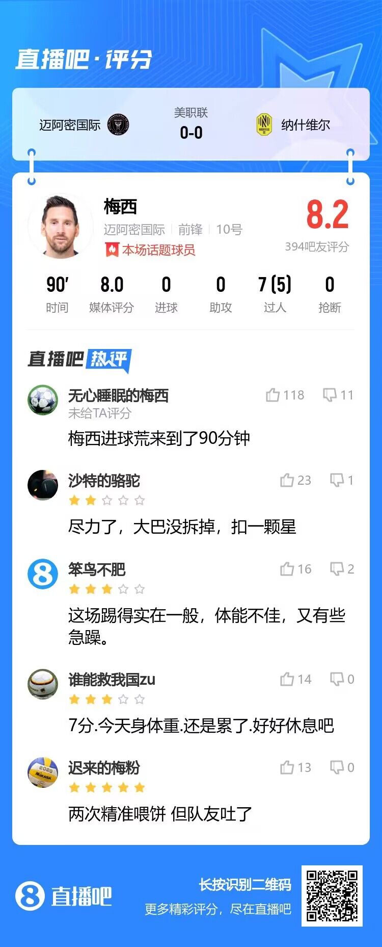 美职联迈阿密国际主场0-0平纳什维尔。梅西无进球、助攻,迈阿密国际仍排在倒数第二。