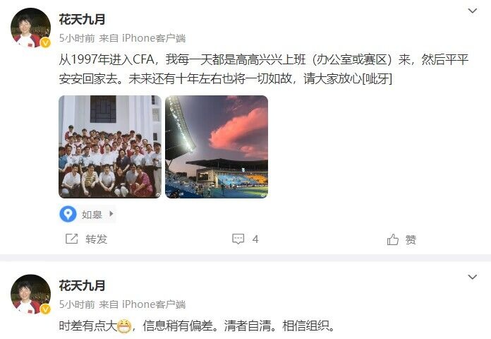 “时差有点大,信息稍有偏差。清者自清。相信组织。”