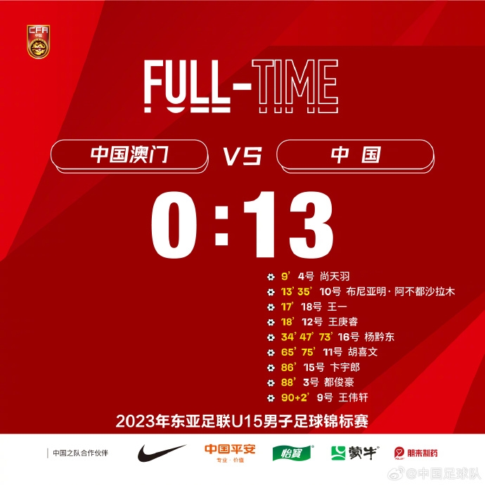 中国队16号杨黔东完成帽子戏法,10号布尼亚明•阿不都沙拉木和11号胡喜文分别打入两球,尚天羽、王一、王庚睿、卞宇郎、都俊豪、王伟轩都有进球入账。