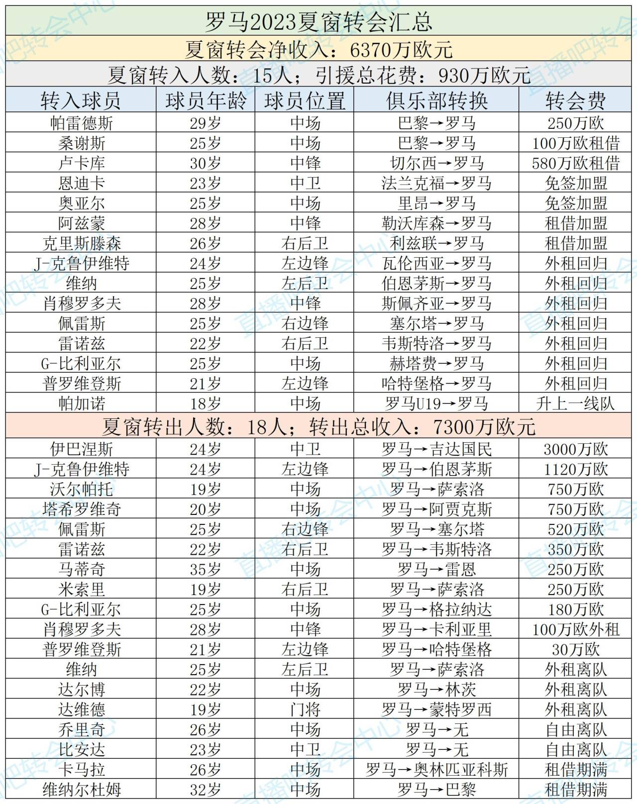直播吧9月2日讯 罗马今夏引援总花费仅930万欧元,签下帕雷德斯,租借桑谢斯、卢卡库,并免签恩迪卡、奥亚尔,租借阿兹蒙、R-克里斯滕森。