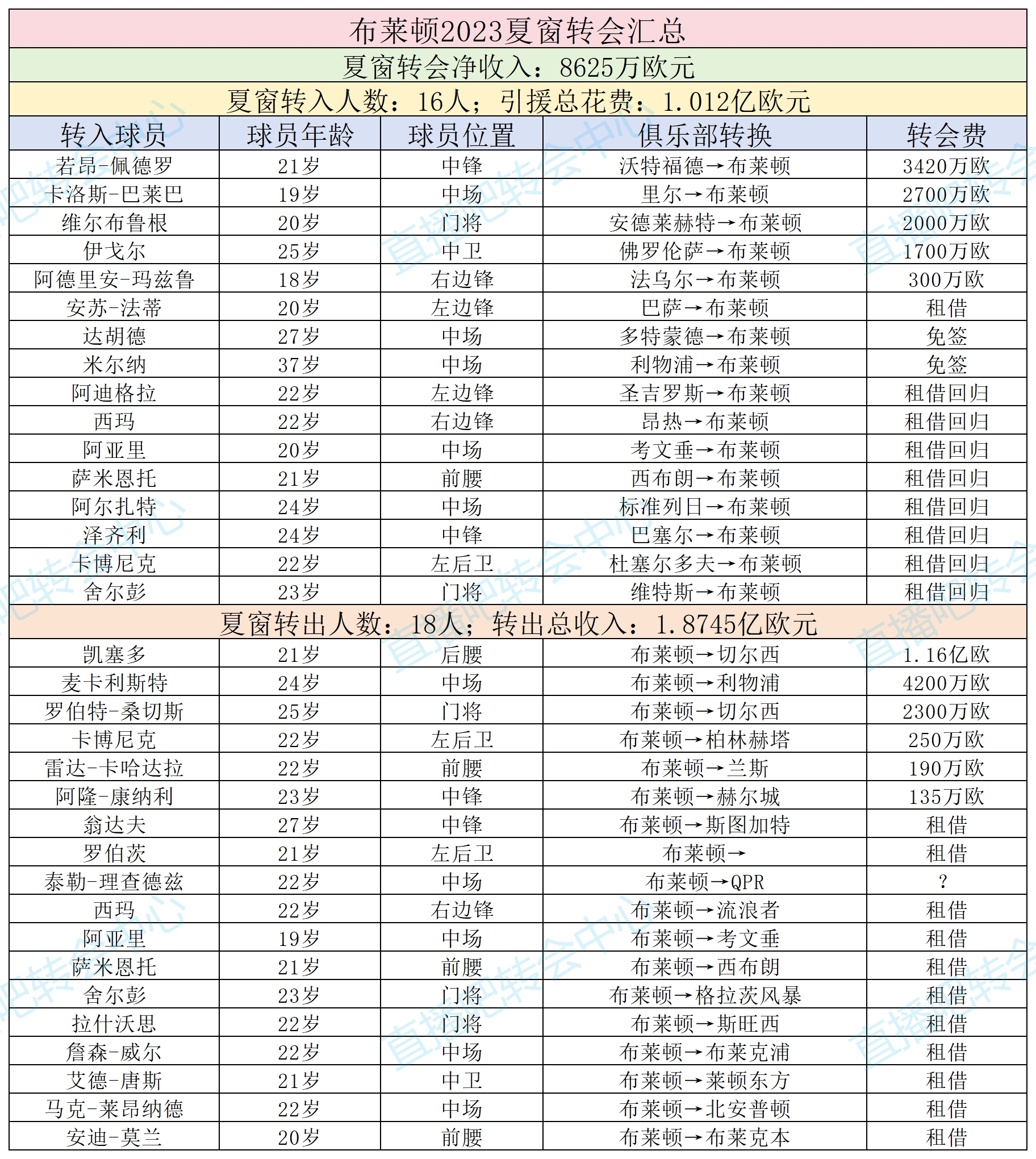直播吧9月2日讯 布莱顿在夏窗大换血,球队出售了中场核心球员凯塞多和麦卡利斯特,夏窗卖人总收入高达约1.88亿欧。
