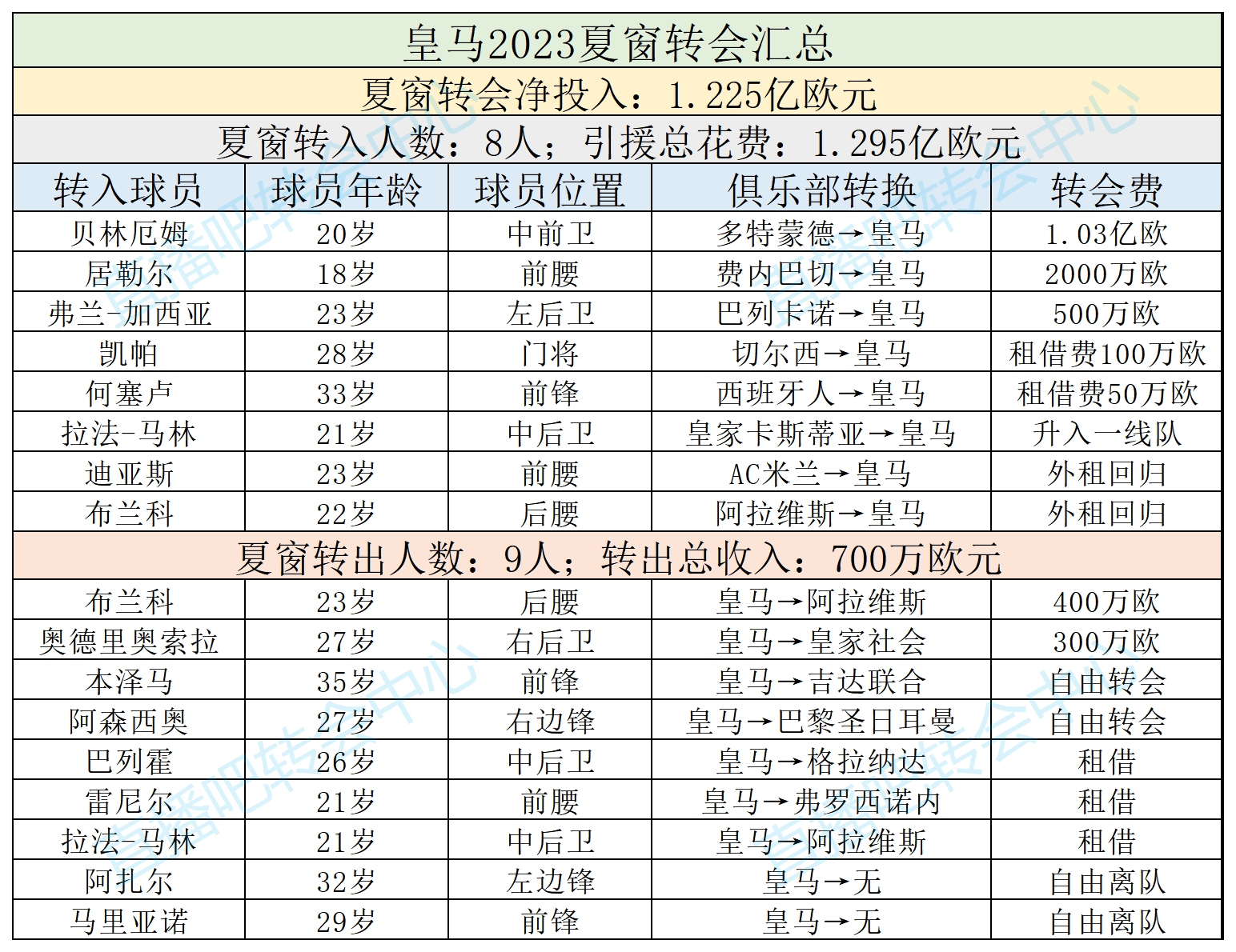 直播吧9月2日讯 皇马2023年夏窗操作结束,俱乐部转入8人,引援总花费1.295亿欧;转出9人,收入700万欧。球队今夏的净支出1.225亿欧元。