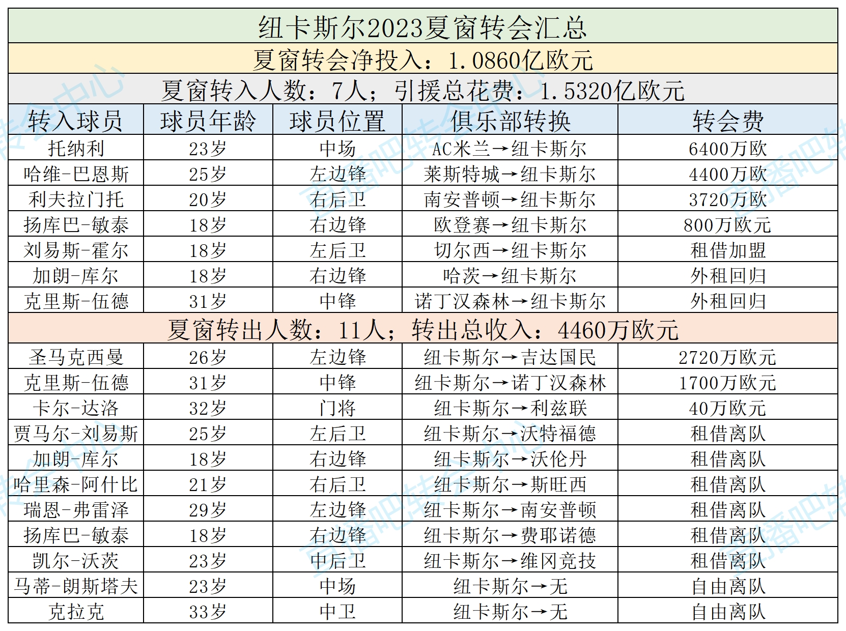 直播吧9月2日讯 2023年夏季转会窗截止,盘点纽卡斯尔这个夏窗的转会情况,纽卡转入7人,其中引进托纳利、哈维-巴恩斯、利夫拉门托和扬库巴-敏泰等球员共花费1.532亿欧元。