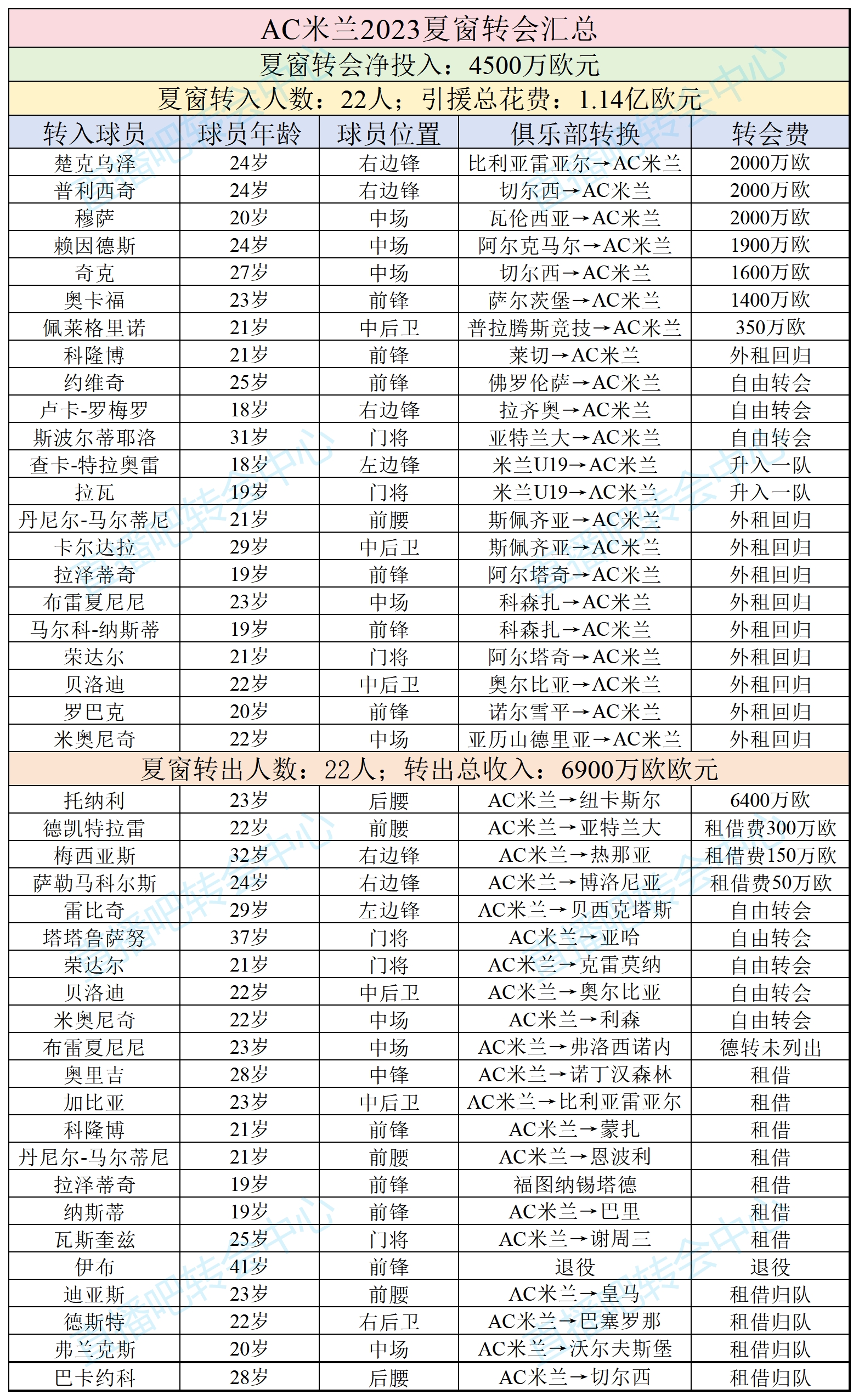 直播吧9月2日讯 2023年夏季转会窗截止,盘点AC米兰这个夏窗转会,转入22人,丘库埃泽、普利西奇、穆萨三人转会费均为2000万欧并列标王,共花费1.14亿欧。23人离队,目前共收入6900万欧,净支出4500万欧。