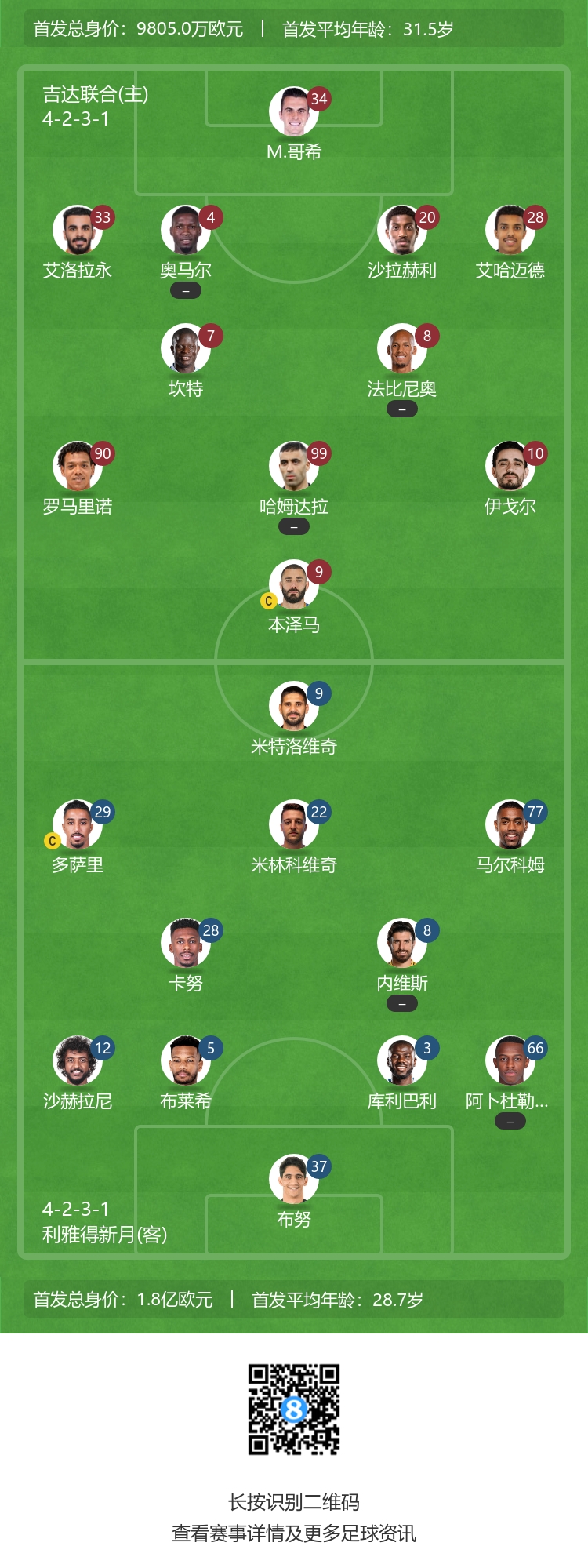 吉达联合首发:34-格罗赫、33-艾洛拉永 20-沙拉希利、5-奥马尔-豪萨维、28-巴沙特、8-法比尼奥、7-坎特、10-科罗纳多、90-罗马里尼奥、99-哈姆达拉、9-本泽马