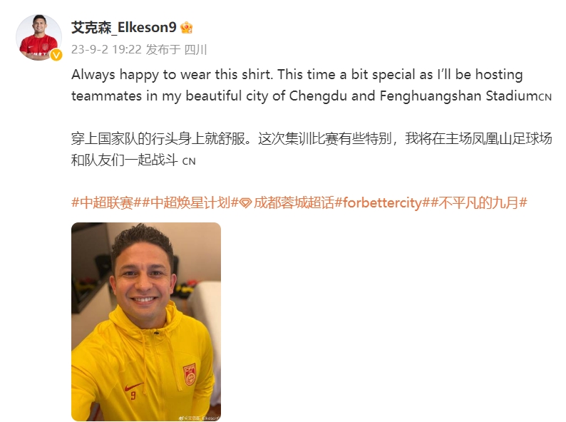 直播吧9月2日讯 国足将在9月9日与12日分别与马来西亚及叙利亚进行热身赛,比赛地点都为成都蓉城主场凤凰山足球场。蓉城球员艾克森入选了本期国足大名单,艾克森也在社交媒体上晒出了自己身穿国家队服装的照片。