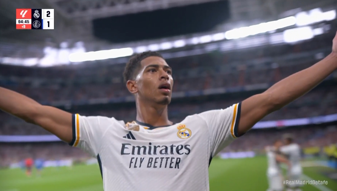第95分钟,巴斯克斯射门,赫塔费门将索里亚想抱住球结果脱手,贝林厄姆跟上补射破门!皇马2-1反超。贝林厄姆西甲开赛4轮打进5球!
