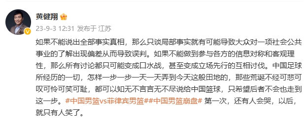 黄健翔在个人社媒写道:如果不能说出全部事实真相,那么只谈局部事实就有可能导致大众对一项社会公共事业的了解出现偏差从而导致误判。