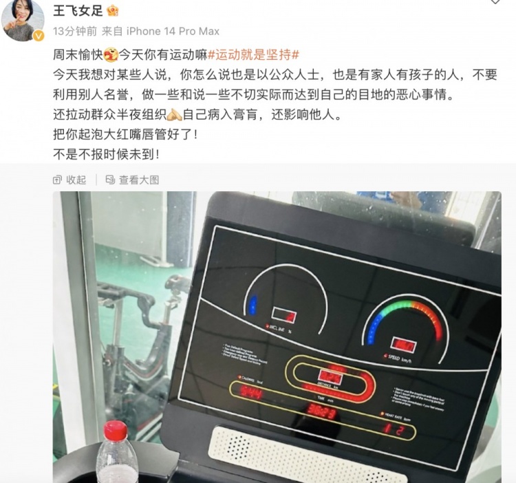 直播吧9月3日讯 今天,前女足国门王飞在社媒发文吐槽,希望一些公众人士不要利用别人名誉而做一些影响他人的恶心事情。