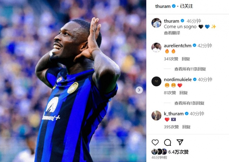 赛后,马库斯-图拉姆更新社媒晒照表示:像梦一样🖤💙✨。