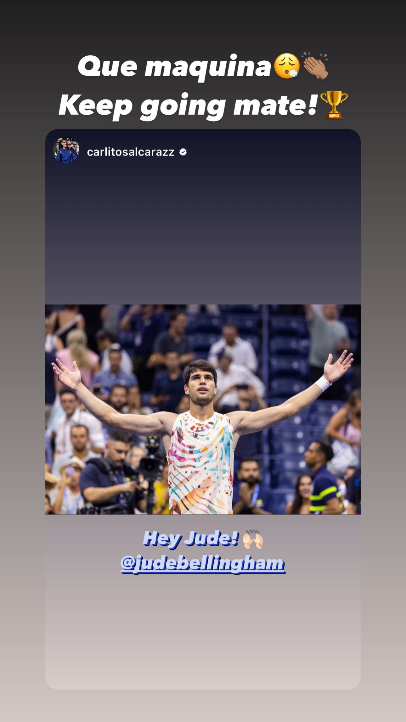 阿尔卡拉斯晒出了自己与贝林厄姆相同的庆祝动作同时配文:“Hey Jude!👏”,贝林厄姆回应写道:“你很出色!继续前进,伙计!🏆”