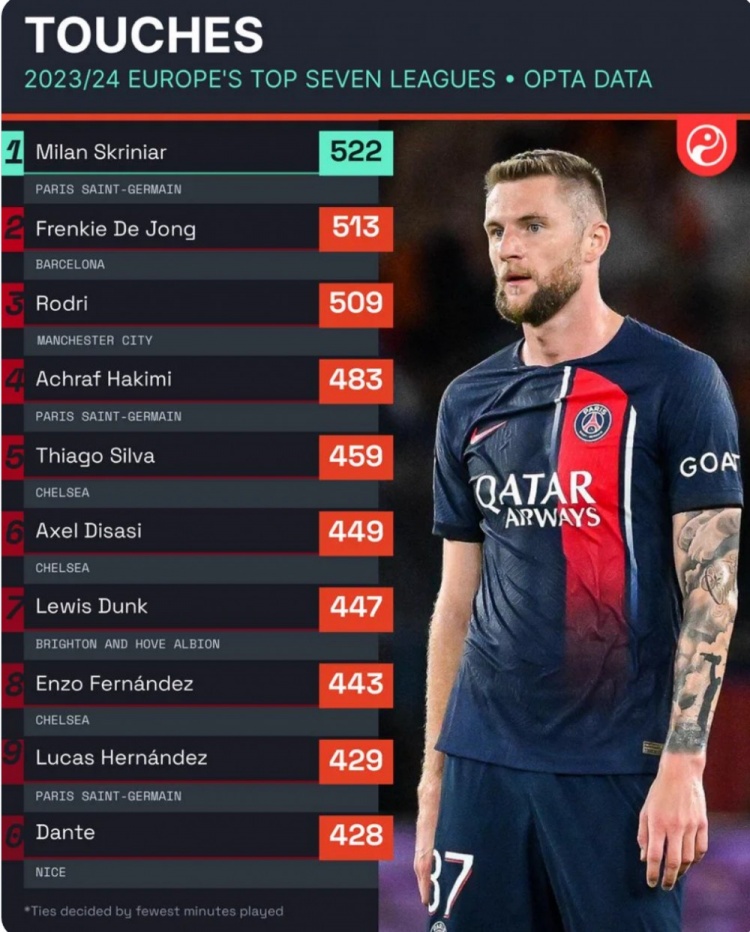 直播吧9月8日讯 Squawka统计了本赛季五大联赛球员的触球次数,并列出榜单,什克里尼亚尔以522次居首,德容、罗德里排名二三位。