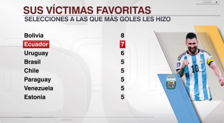 直播吧9月8日讯 在北京时间今天上午进行的南美世预赛中,梅西任意球破门,帮助阿根廷1比0击败厄瓜多尔,据ESPN统计,厄瓜多尔被梅西打进7球,是被梅西破门第二多的国家队。
