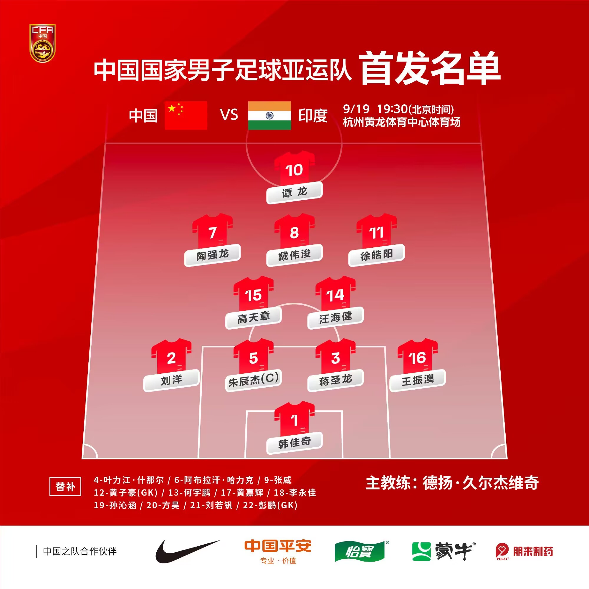 国足亚运队首发:1-韩佳奇、2-刘洋、3-蒋圣龙、5-朱辰杰、16-王振澳、11-徐皓阳、14-汪海健、15-高天意、7-陶强龙、8-戴伟浚、10-谭龙