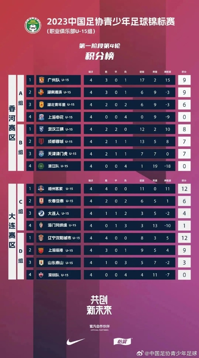 2023中国足协青少年足球锦标赛(职业俱乐部U-15组)第一阶段第4轮赛果