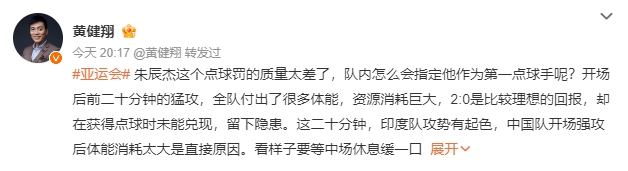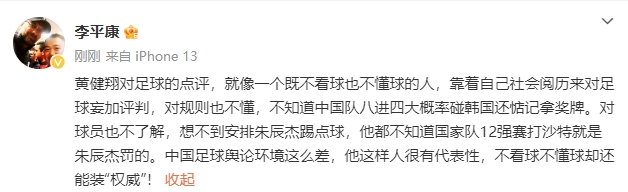 李平康:“黄健翔对足球的点评,就像一个既不看球也不懂球的人,靠着自己社会阅历来对足球妄加评判,对规则也不懂,不知道中国队八进四大概率碰韩国还惦记拿奖牌。对球员也不了解,想不到安排朱辰杰踢点球,他都不知道国家队12强赛打沙特就是朱辰杰罚的。中国足球舆论环境这么差,他这样人很有代表性,不看球不懂球却还能装权威!”