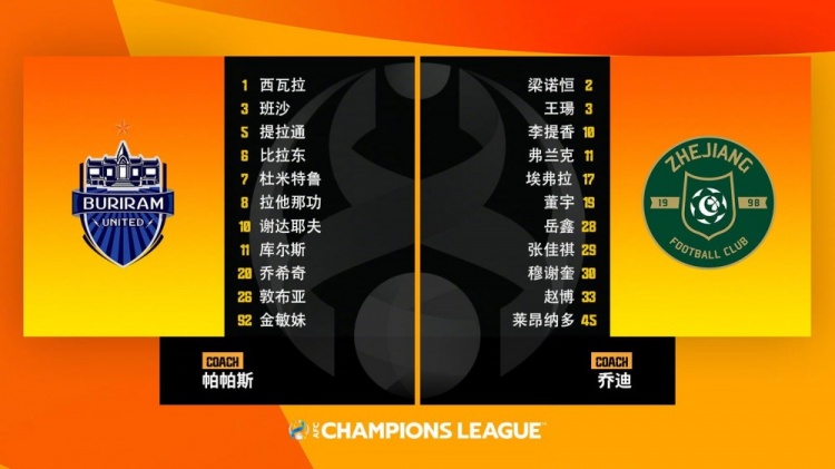 9月20日18点,亚冠小组赛H组首轮,浙江队客场挑战泰国武里南联,这场比赛是浙江队12年后的首场亚冠正赛,赛前双方首发阵容已经公布。