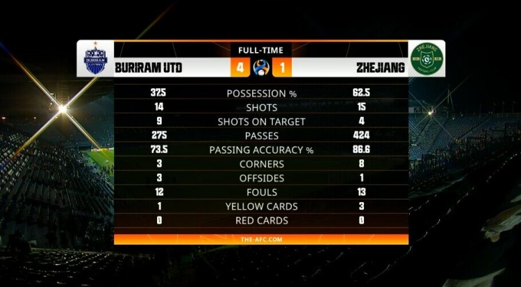 浙江队vs武里南联全场比赛数据如下