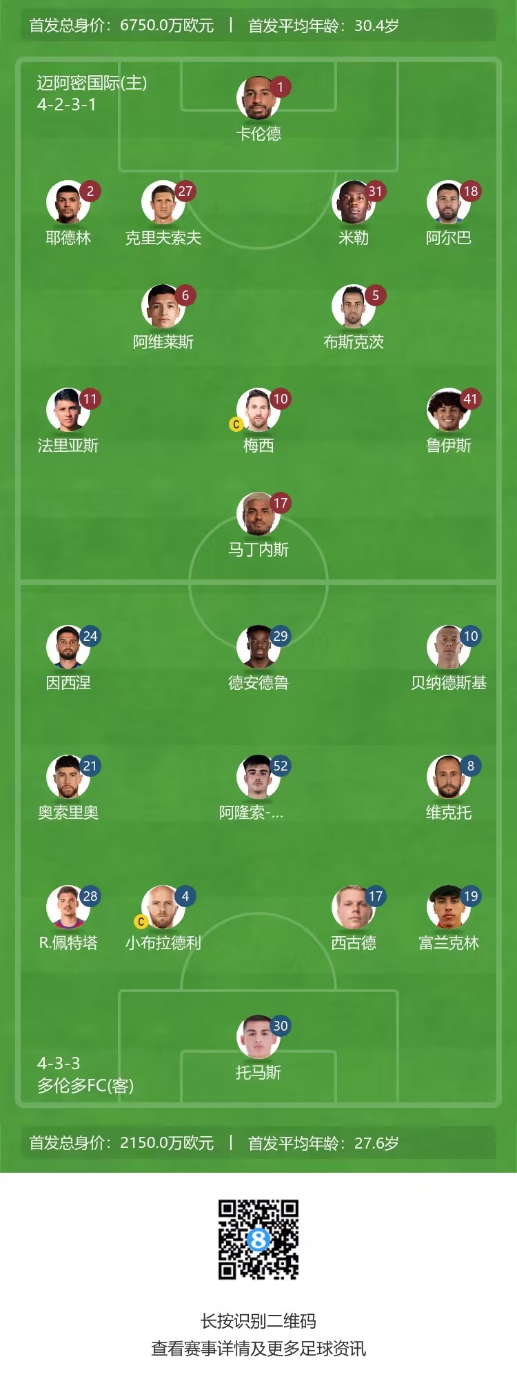 迈阿密国际首发:1-卡伦德、2-耶德林、6-阿维莱斯、31-米勒、27-克里夫索夫、18-阿尔巴、5-布斯克茨、41-大卫-鲁伊斯、10-梅西、11-法里亚斯、17-马丁内斯