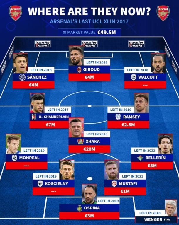中场:扎卡(2023年离队)、张伯伦(2017年离队)、拉姆塞(2019年离队)
