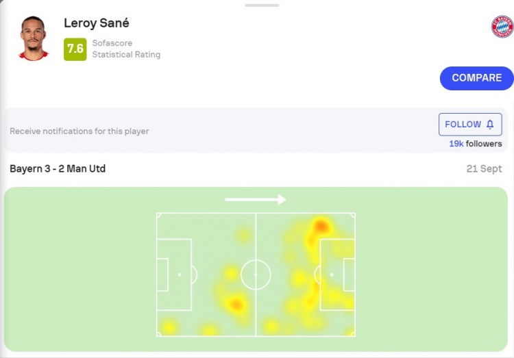 直播吧9月21日讯 欧冠首轮,拜仁对阵曼联。萨内首发出战87分钟并打进一粒进球,球员重点数据如下: