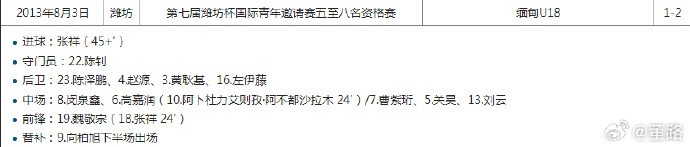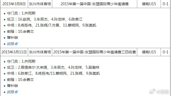 董路晒出的是国少队2013年潍坊杯和2015年中国-东盟青少年邀请赛的首发,2013年潍坊杯五至八名资格赛,U15国少队1-2不敌缅甸U18,首发为陈钊、陈泽鹏、赵源、黄耿基、左伊藤、闵泉鑫、高嘉润、曹紫珩、关昊、刘云、魏敬宗,替补有阿不都沙拉木、张祥、向柏旭。