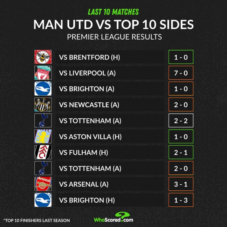 曼联近10次联赛对阵英超前十球队战绩(指上赛季最终排名前十):