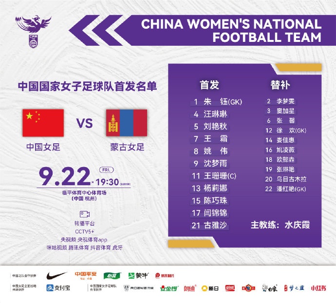 今天19:30,将要进行杭州第19届亚运会女子足球比赛小组赛的一轮比赛,中国女足将对阵蒙古女足,CCTV5+等多个平台将对本场比赛进行直播,欢迎大家收看!一起为女足姑娘们加油!
