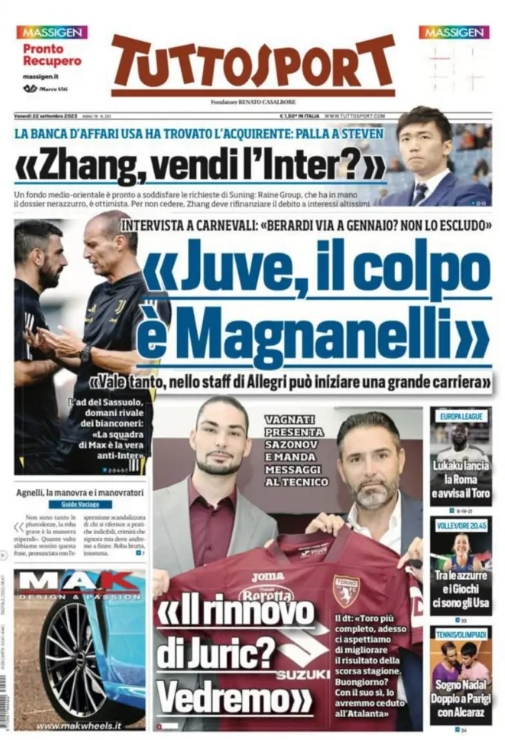 不过尤文图斯的喉舌媒体《都灵体育报》不忘在场外给蓝黑军团制造麻烦,近日该媒体在头版醒目位置打出标题“张,你会卖掉国米吗?”,据都体报道,纽约投行雷恩集团已经为国米寻找到新的买家——一家来自中东的基金准备满足苏宁要价,现在是否出售俱乐部取决于国米主席张康阳。