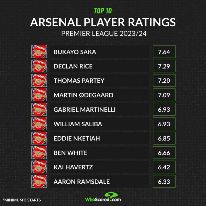 直播吧9月24日讯 WhoScored公布了阿森纳队内本赛季评分排名前十的球员(最少三次首发),其中萨卡场均7.64分第一,赖斯场均7.29分第二,哈弗茨场均6.42分第九。