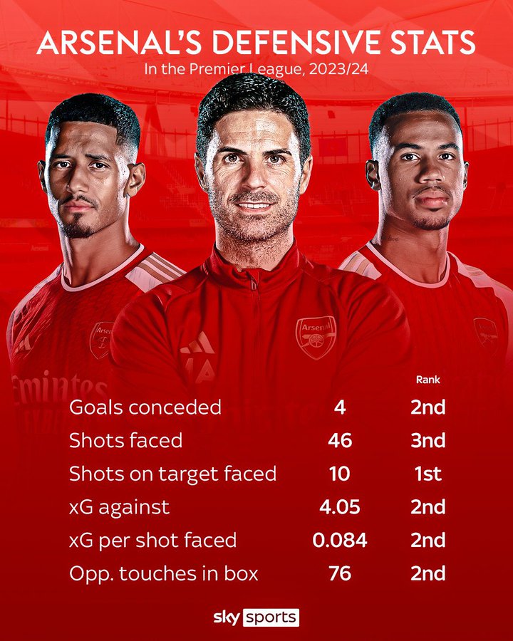 直播吧9月24日讯 《天空体育》盘点了阿森纳在本赛季至今在英超赛场的防守数据,其中多项数据排名前列。