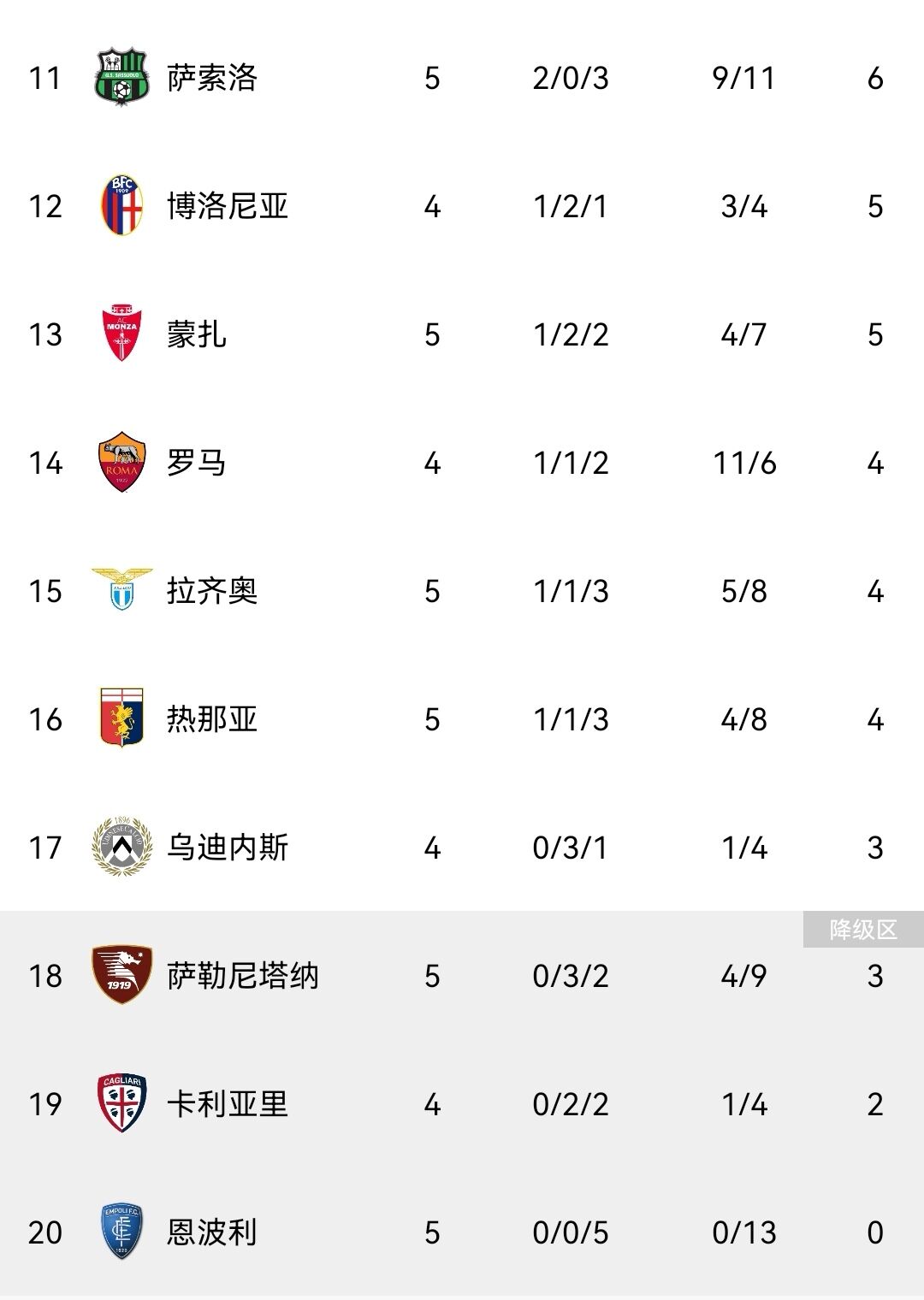 直播吧09月24日讯 在今天结束的一场意甲第5轮比赛中,恩波利主场0-1不敌国际米兰。恩波利在联赛前5轮中全败,丢13球且未进一球。