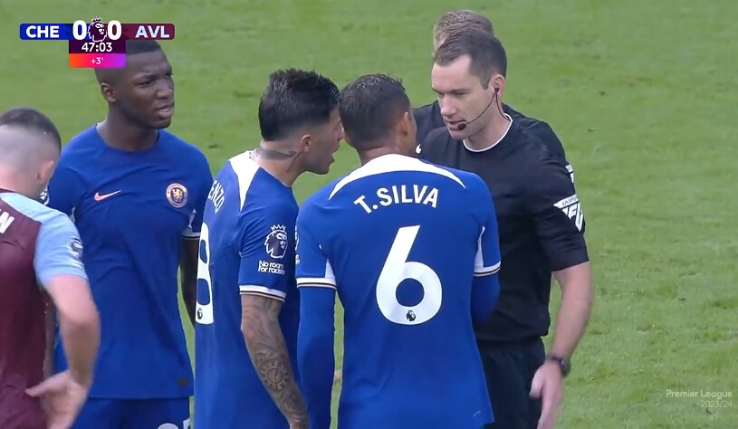 切尔西球员也非常不解,想向裁判了解情况。上半场比赛切尔西与阿斯顿维拉战成0-0平。